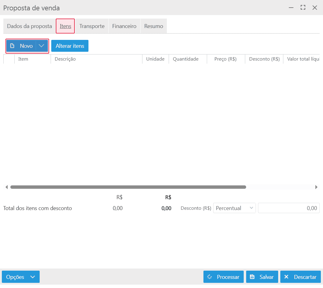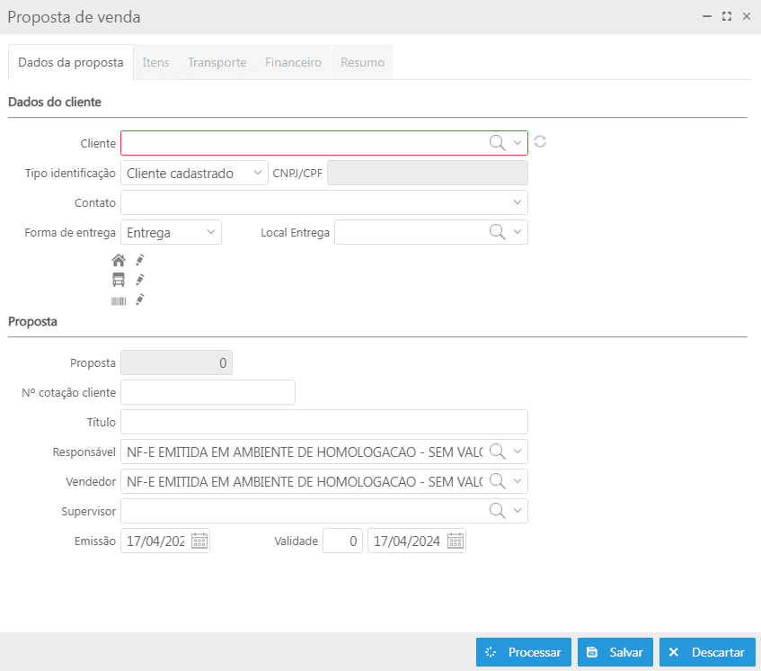 Ao clicar no botão Novo é apresentada a tela para criar uma proposta, dividida em abas: Dados da proposta, Itens, Transporte, Financeiro e Resumo.