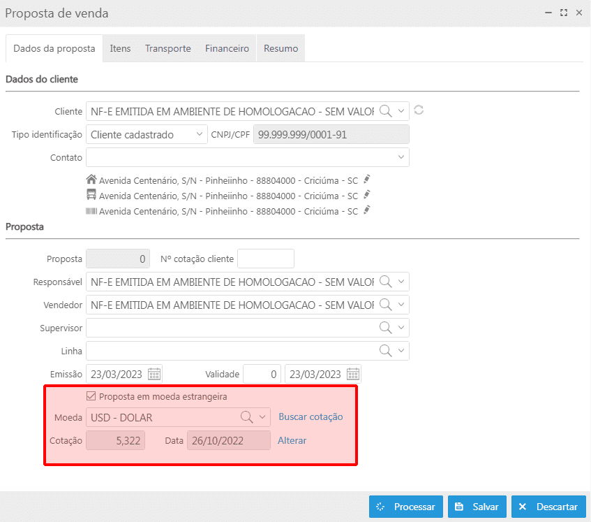 Se utilizar moeda estrangeira é necessário buscar a cotação da moeda.