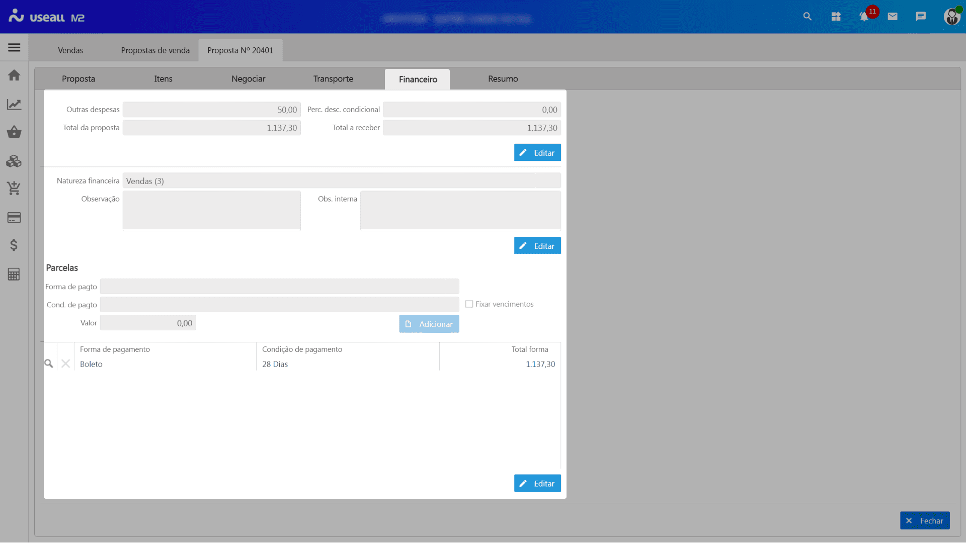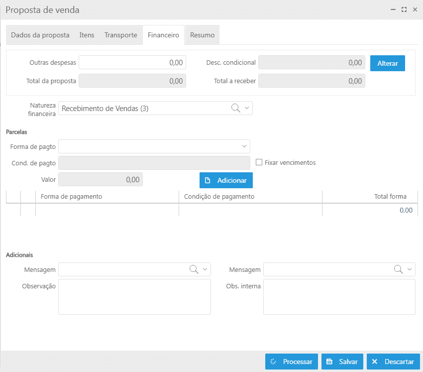 Nesta aba serão exibidas as informações de despesas, valor final da proposta, natureza financeira, formas de pagamento e informações adicionais, permitindo realizar alterações quando necessário.