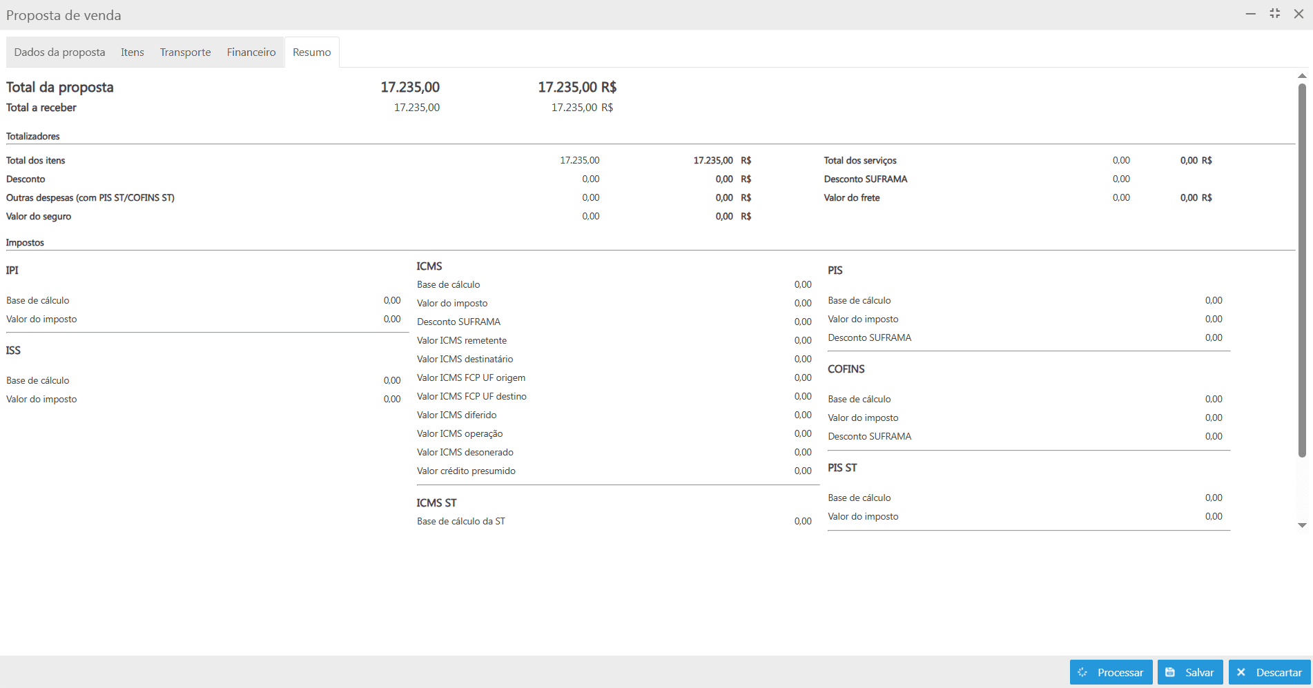 Nesta aba é exibido um resumo de todas as informações da proposta, para conferência.