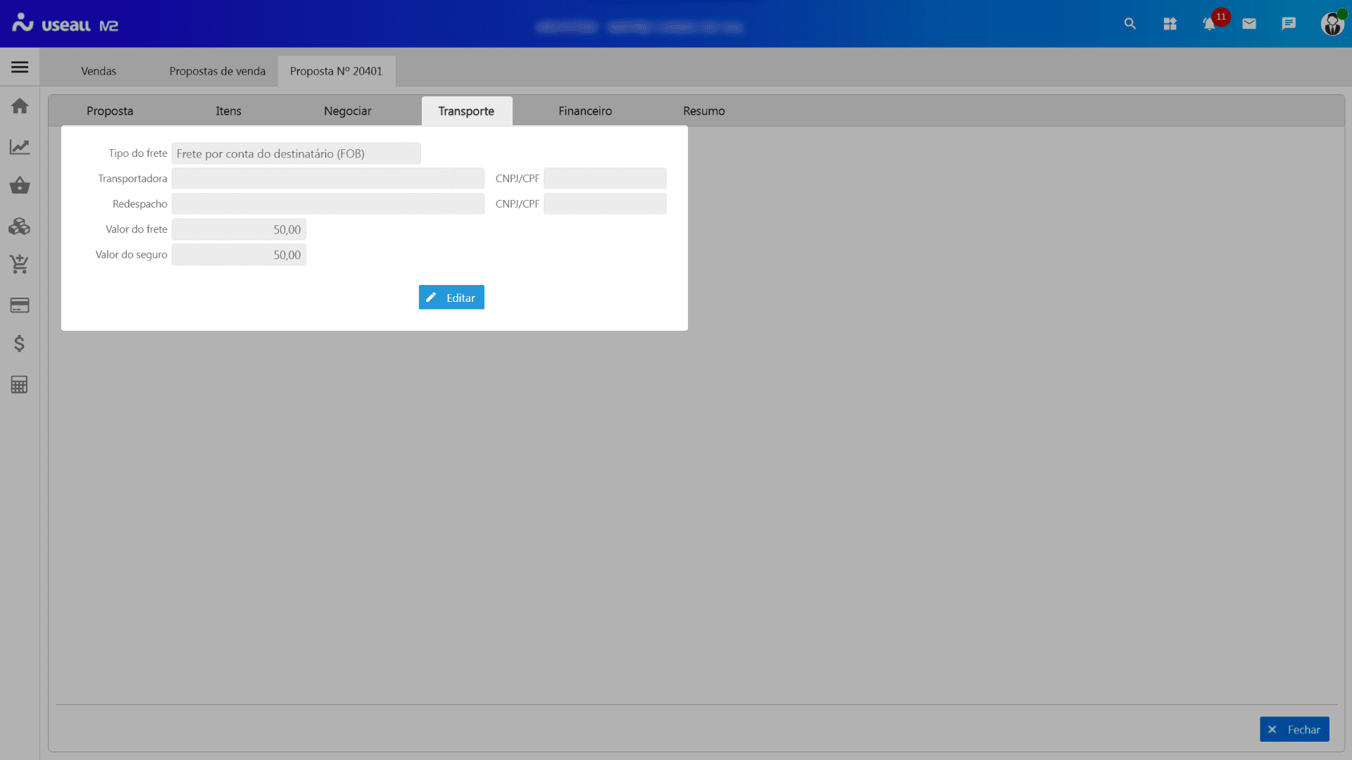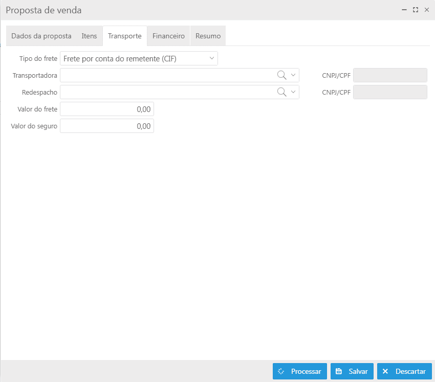Nesta aba serão exibidas as informações do transporte para a proposta, permitindo realizar alterações quando necessário.