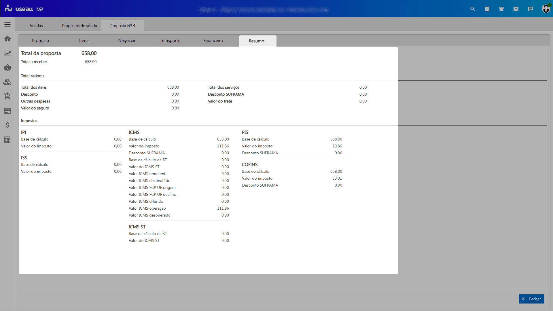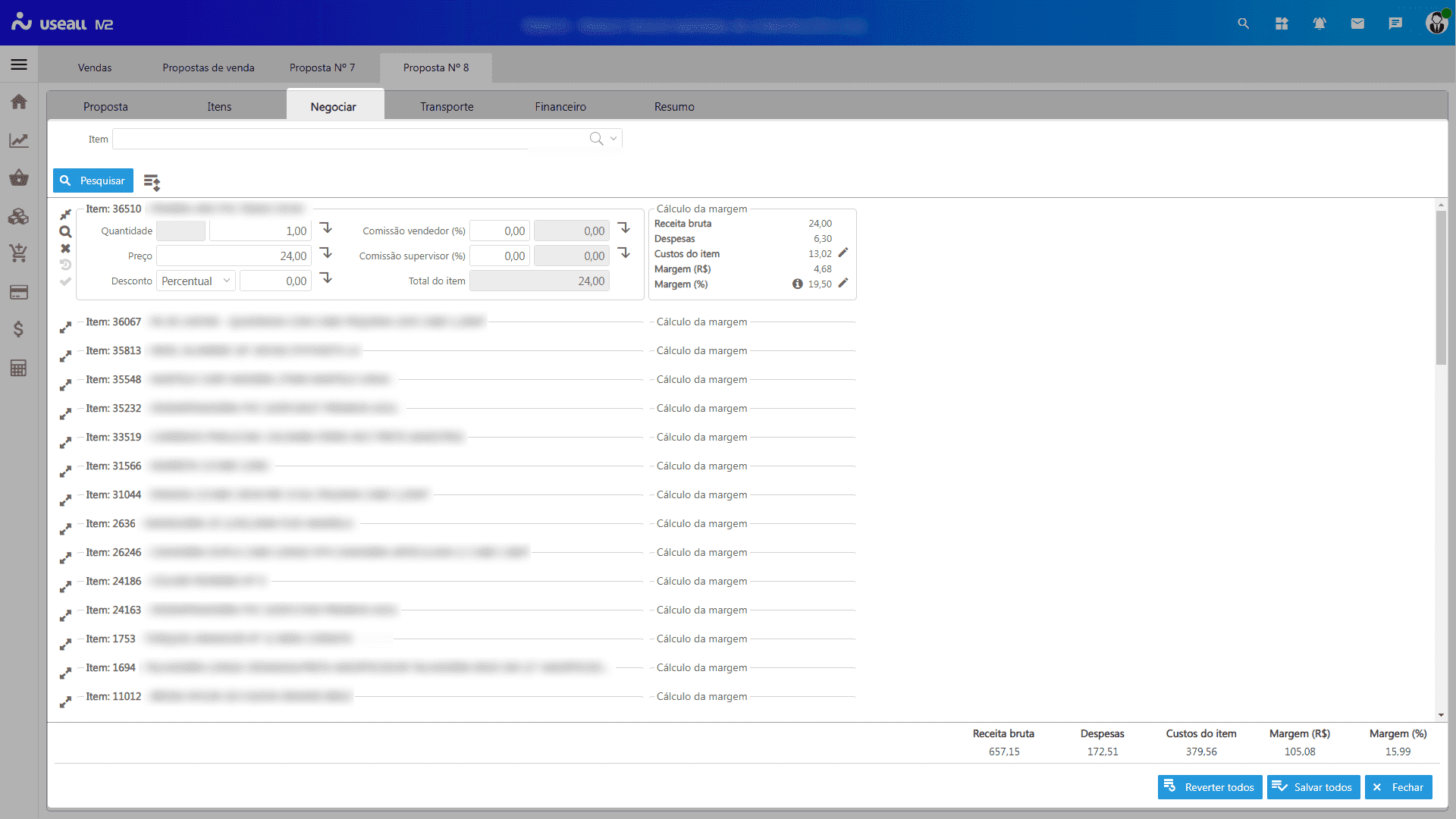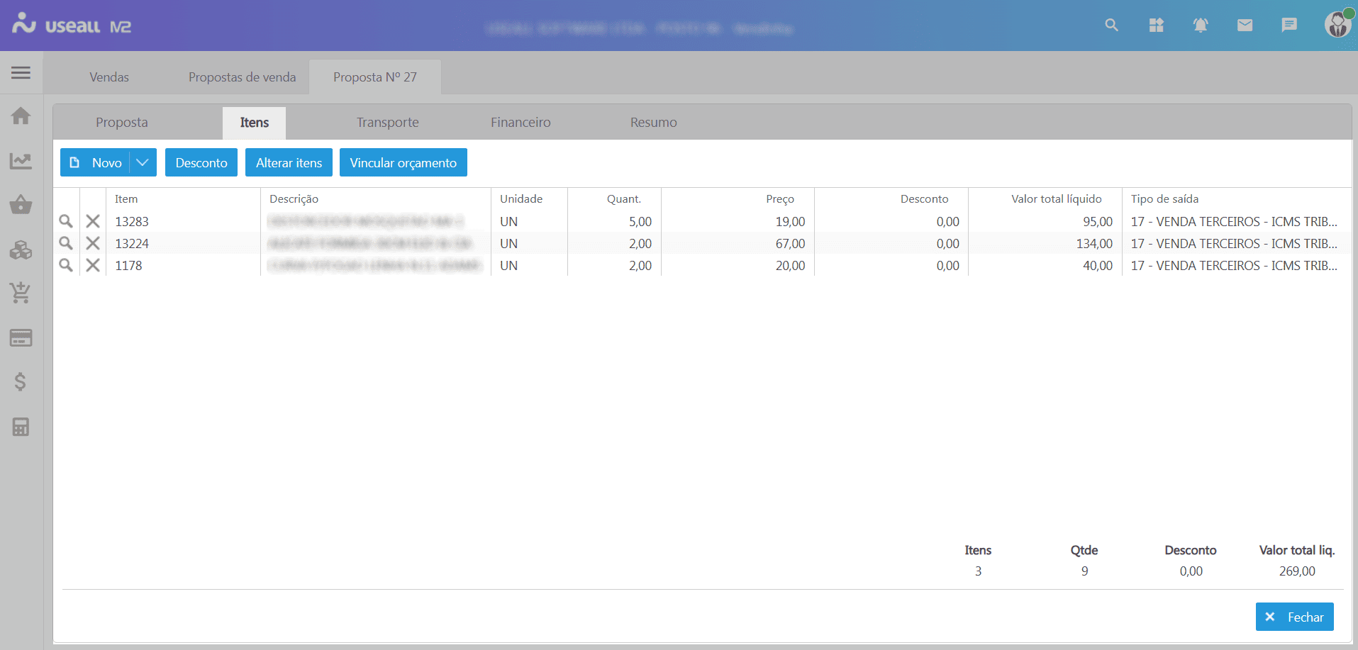 No rodapé é possível visualizar quantos itens distintos tem na proposta, a quantidade total de itens e o valor total líquido.