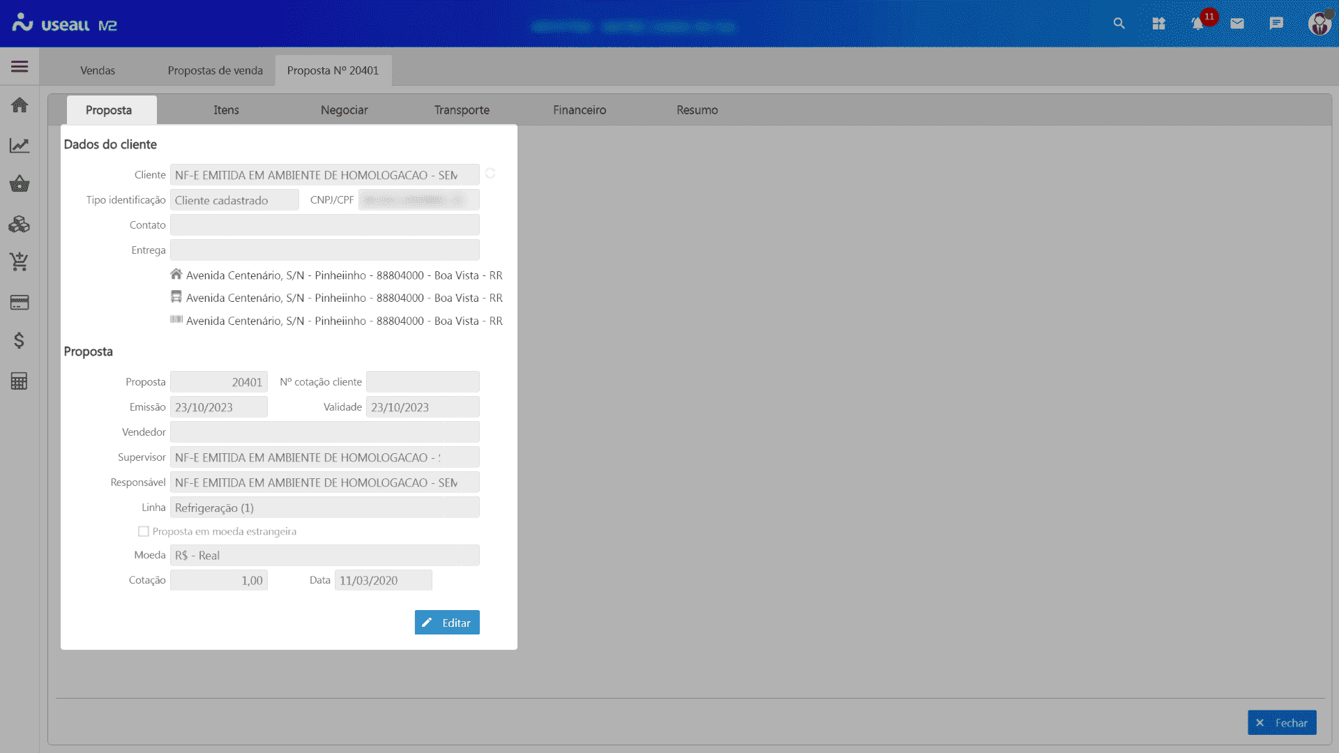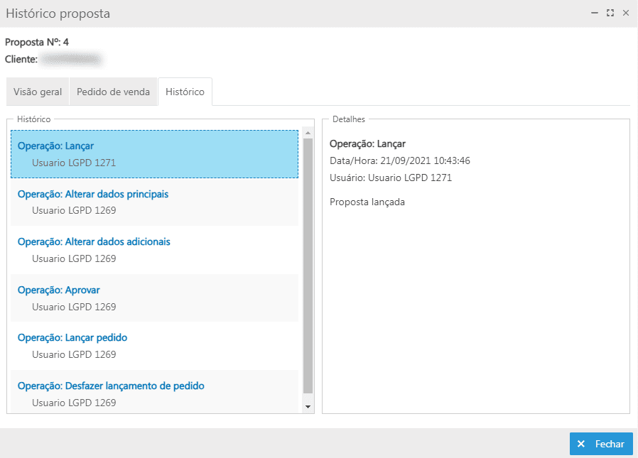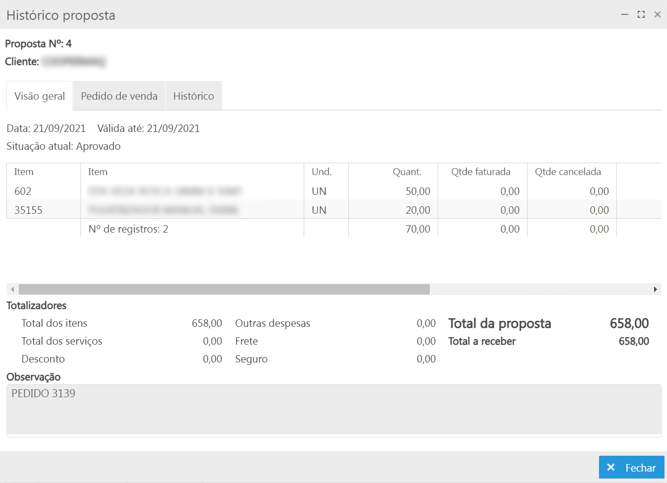 Nesta aba é apresentada a data de criação e validade da proposta, situação atual, itens, totalizadores e observação;