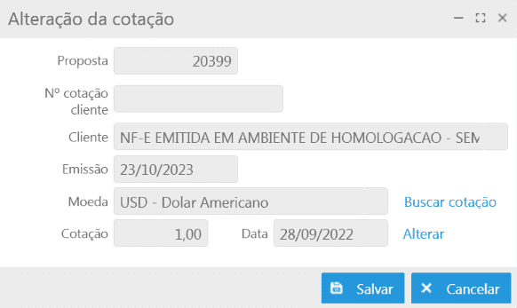 Alterar cotação: permite alterar a cotação de moedas de propostas com status em aberto ou parciais. Ao clicar nesta opção apresentará a tela para alterar a cotação de moeda;