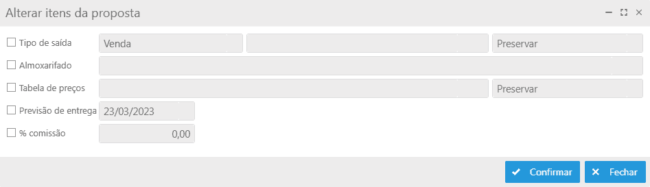Ao clicar no botão Alterar itens será possível alterar as seguintes informações do item na proposta: Tipo de saída, Almoxarifado, Tabela de preços, Previsão de entrega e % comissão. Sendo possível selecionar diversos itens para alteração, gerando assim uma alteração em massa das informações.