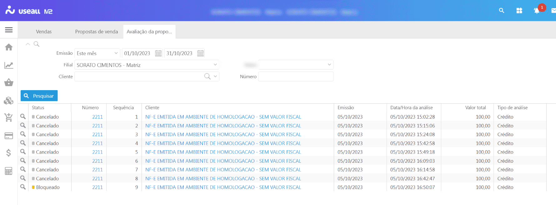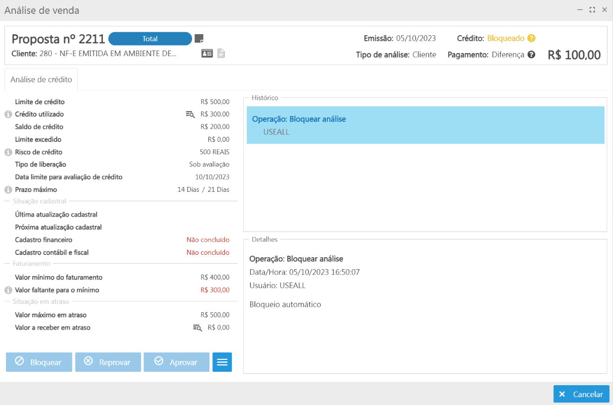 Análise: ao selecionar esta opção abrirá a análise da proposta de venda;