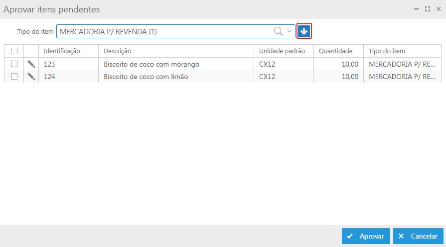 Ao aprovar uma proposta contendo itens não cadastrados, o sistema solicita o preenchimento do campo "Tipo do item" para concluir o cadastro desses itens. Numa proposta contendo mais de um item não cadastrado é possível informar o Tipo de item em lote, basta selecionar os itens na tela "Aprovar itens pendentes", selecionar o Tipo de item e clicar no botão