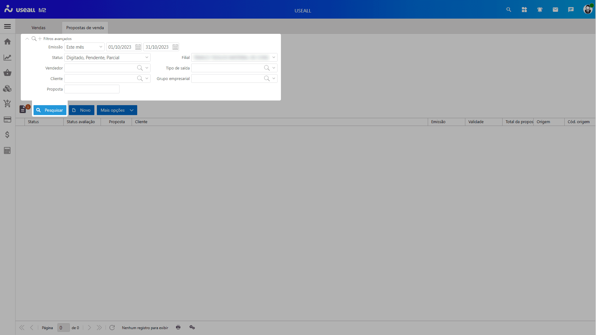Após aplicado os filtros, pode-se clicar no botão Pesquisar para apresentar as informações na grid.