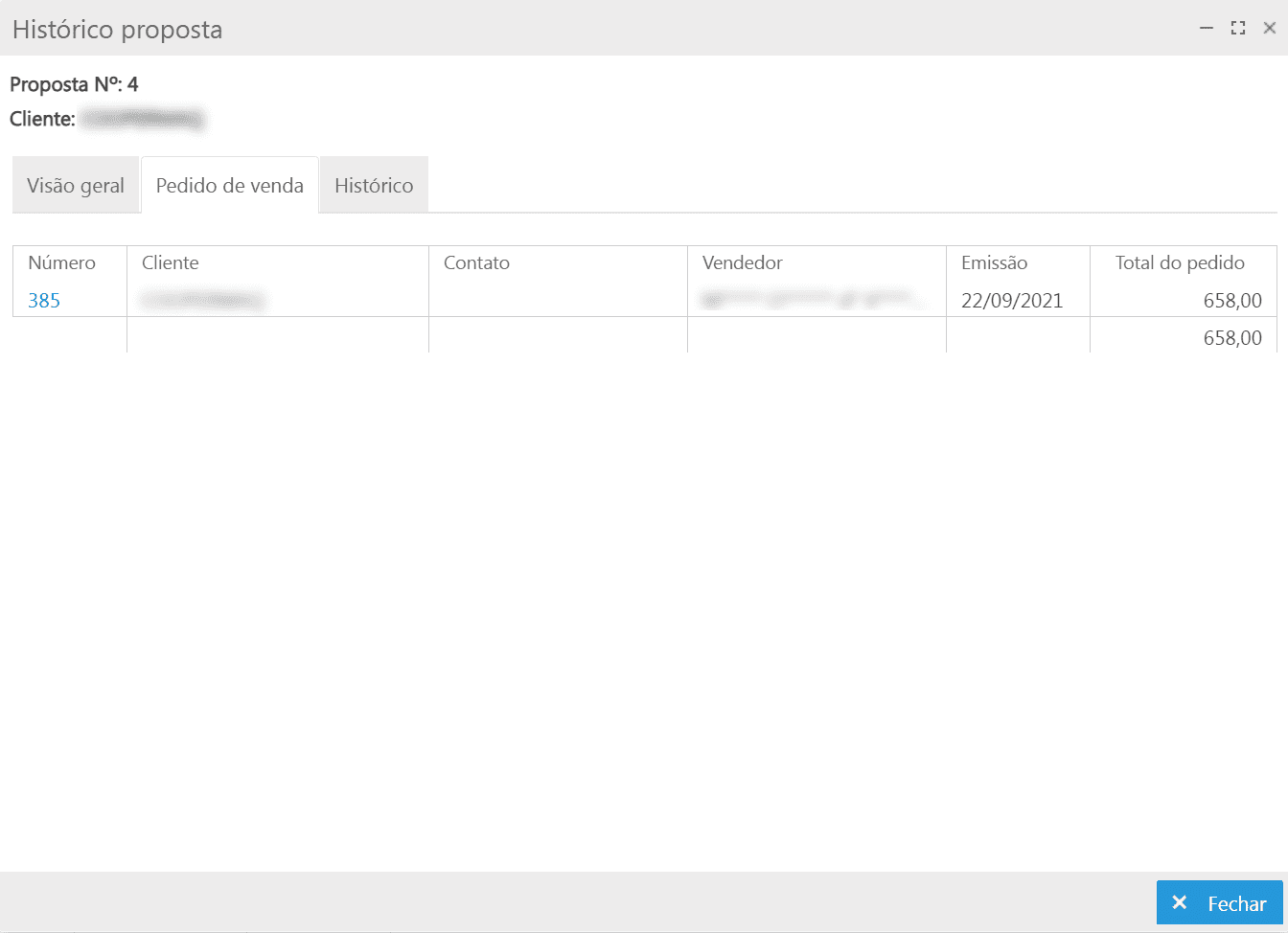 Nesta aba é apresentado o número do pedido, nome do cliente, vendedor responsável da proposta, data de emissão e total do pedido;