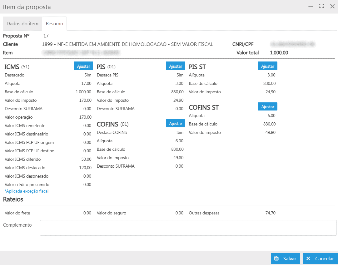 Na aba Resumo da tela Item da proposta são apresentados os dados de impostos, sendo possível ajustá-los conforme necessidade, através do botão Ajustar ao lado de cada imposto.