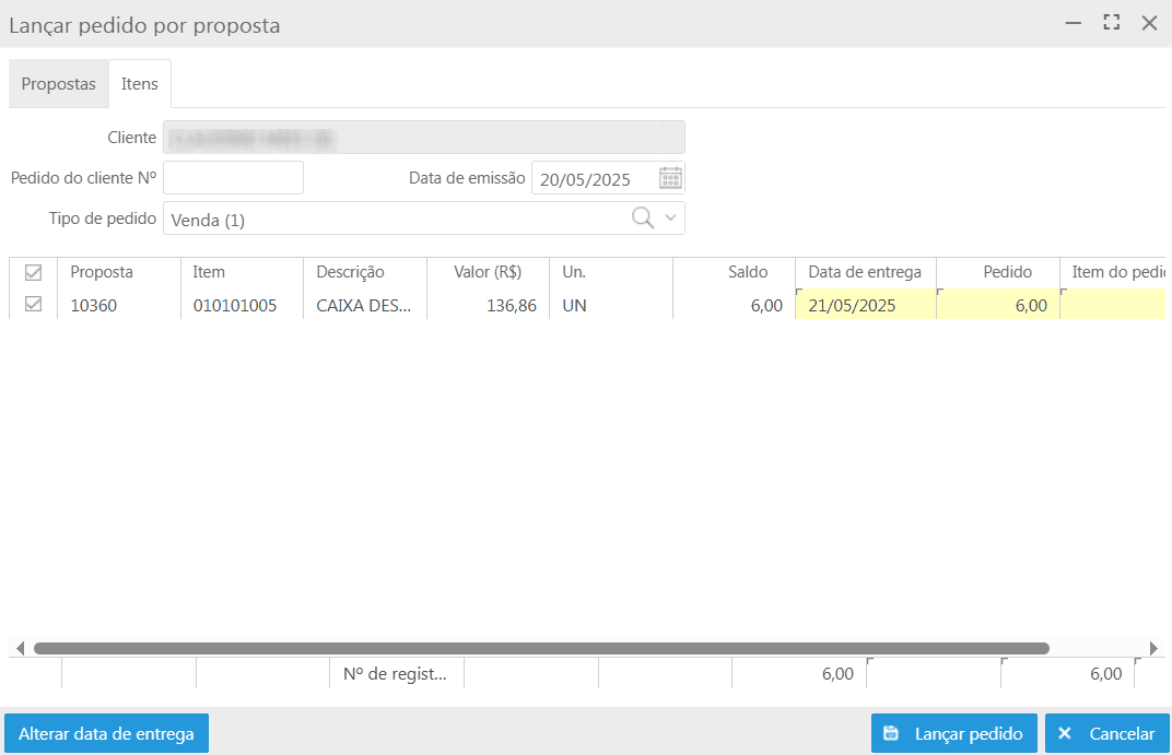Nesta aba são apresentados os itens da proposta, sendo possível alterar os dados das colunas Data de entrega, Pedido e Item do pedido do cliente. A tela apresenta o botão Alterar data de entrega, sendo possível alteração da data em lote, basta selecionar todos os itens, clicar no devido botão e informar a data desejada. Ao clicar no botão Alterar, a nova data será replicada para todos os itens.