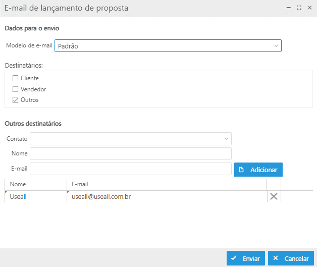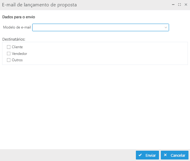 Enviar lançamento de proposta: abre a tela que permite selecionar o modelo de e-mail e para quais destinatários, será enviada a proposta;