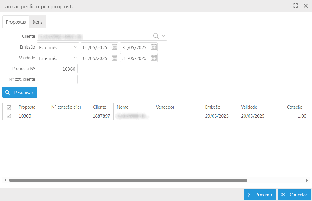 Nesta aba são apresentados os filtros de busca, sendo possível filtrar as propostas. Após aplicar o filtro, basta clicar no botão Pesquisar, para exibir os dados da proposta na grid de informações. Deve-se selecionar a(s) proposta(s) desejada(s) e clicar no botão Próximo, sendo direcionado para a aba Itens.