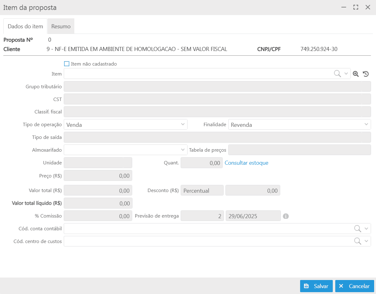 Ao clicar no botão Novo, a tela Item da proposta é exibida sendo possível adicionar os itens individualmente, como também adicionar itens que não estejam cadastrados no sistema. Para os itens não cadastrados deve-se preencher alguns campos necessários para calcular a tributação dos itens.
