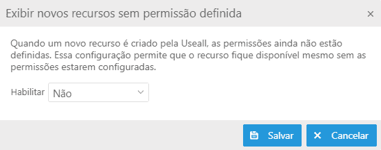 Quando selecionado a opção Sim os novos recursos ficarão disponíveis mesmo sem as permissões definidas. Se marcar a opção Não será necessário realizar as configurações de permissões para que os usuários possam acessar.