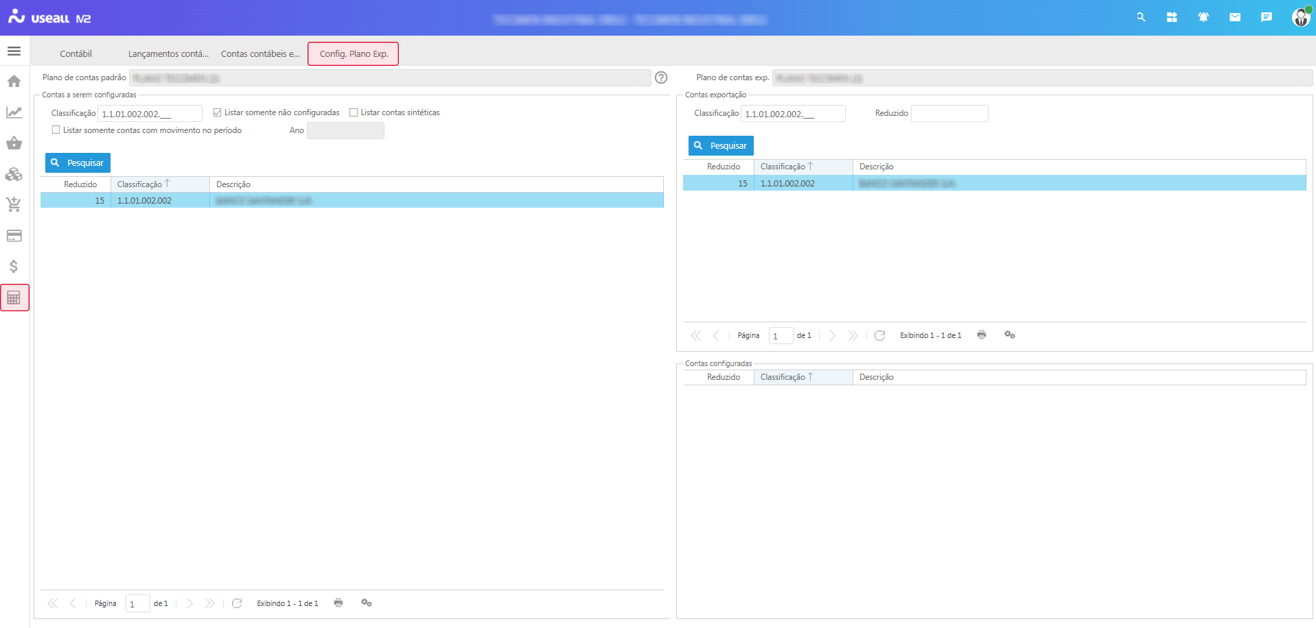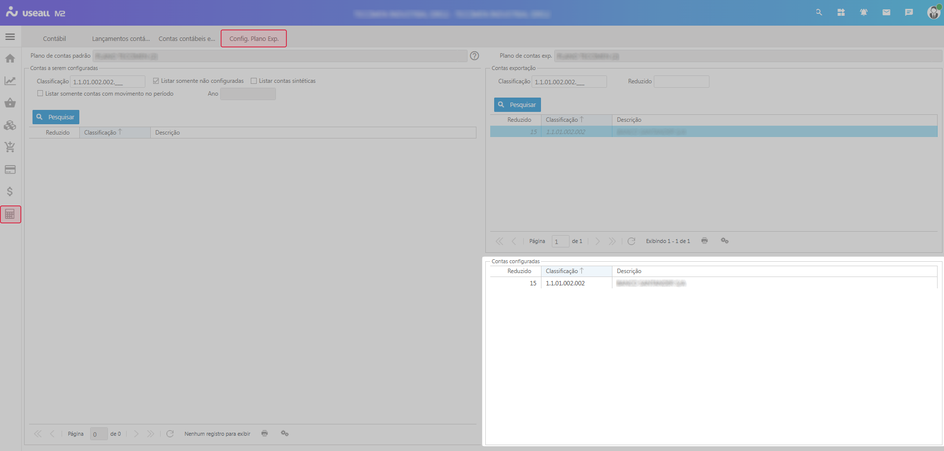Na tela Config. Plano Exp., serão exibidos três quadros: Contas a serem configuradas, Contas exportação e Contas configuradas.