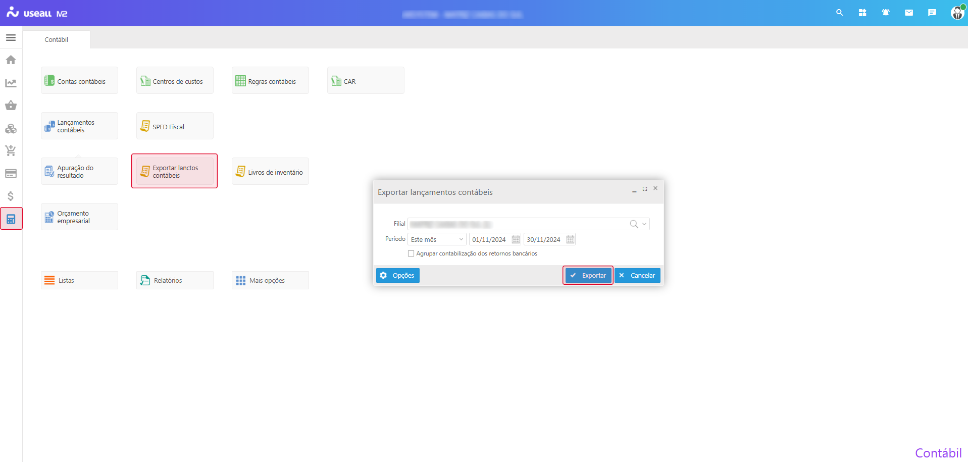 Configuração para Exportação de lançamentos contábeis