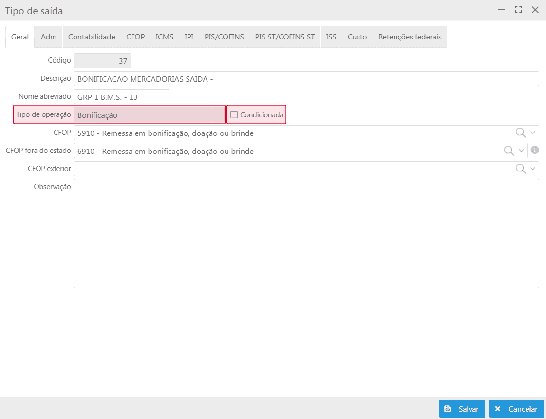 O sistema irá contar com a inclusão do parâmetro "Condicionada", no cadastro de Tipos de Saída.