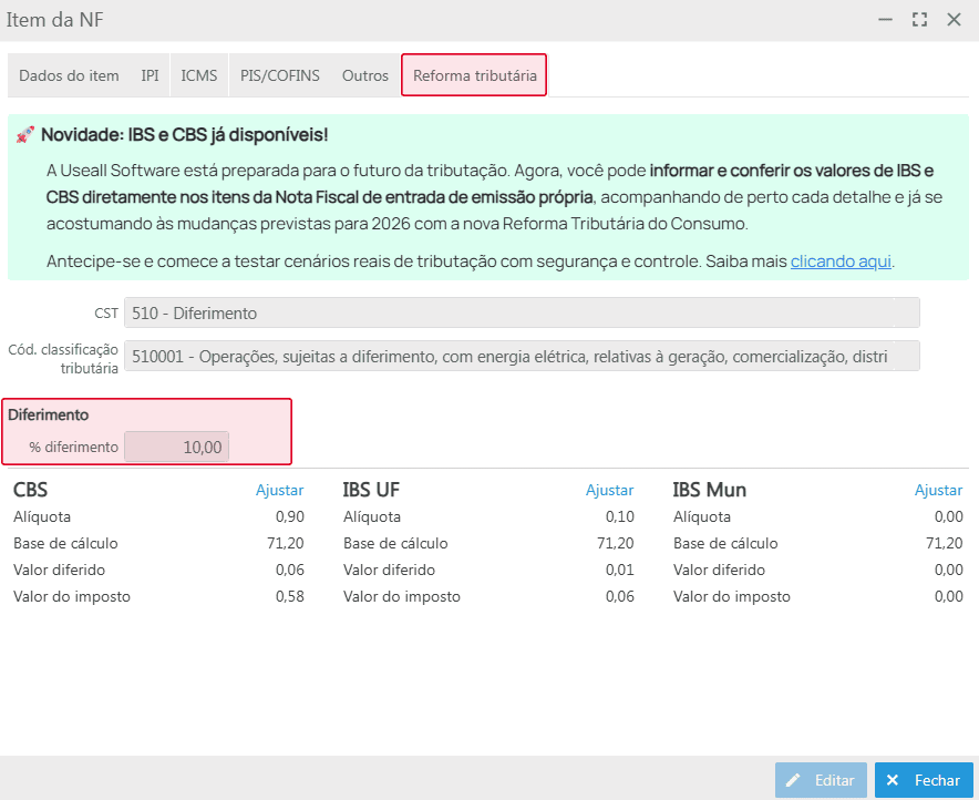 Na tela Item da NF, disponível na aba Itens da Nota fiscal de entrada, tem-se a nova aba Reforma tributária contendo as informações dos novos tributos, juntamente com o campo % diferimento.
