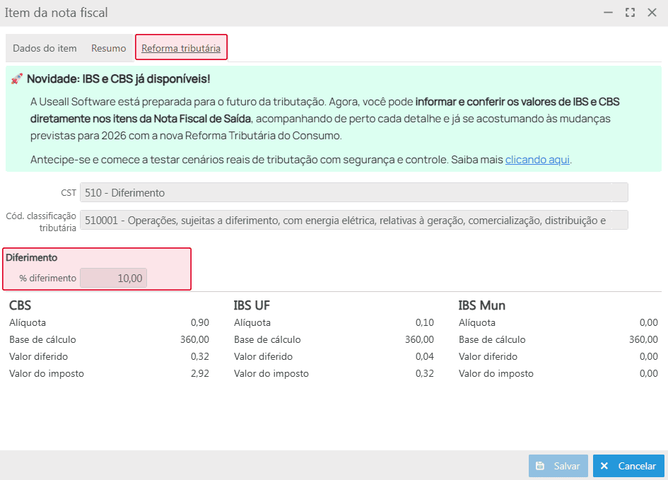 Na tela Item da nota fiscal, disponível na aba Itens da caixa de faturamento ou da nota fiscal de saída, tem-se a nova aba Reforma tributária contendo as informações dos novos tributos, juntamente com o campo % diferimento.