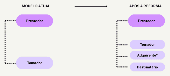 Atualmente existem as figuras do Prestador e do Tomador, onde o prestador é quem executa o serviço, enquanto o tomador é quem o contrata. Com a nova reforma, passam a existir também os papéis de Adquirente e Destinatário. O adquirente é o responsável pelo pagamento do serviço, já o destinatário é quem efetivamente recebe o bem ou o serviço, podendo ou não ser o mesmo que o adquirente.